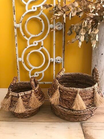 とってもインパクトがあるタッセルが付いてるバスケットです。