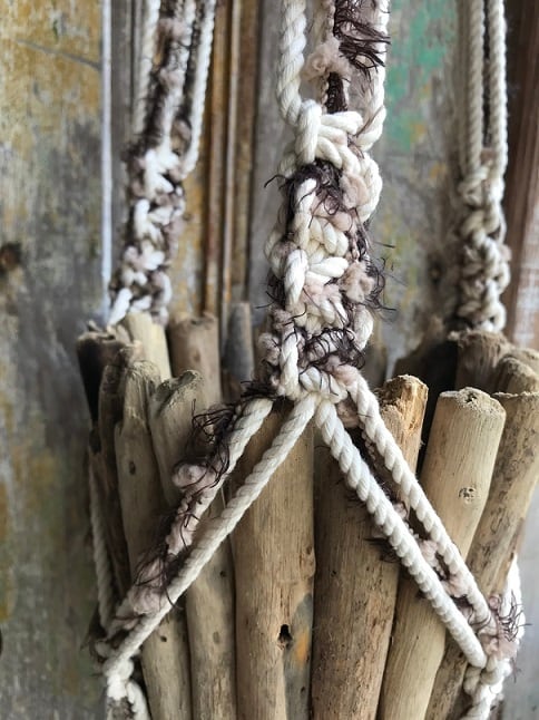 太さ4mmのコットンロープと、海外で買い付けてきたウッドリングをカラー紐と一緒に埋め込んでしっかりと編んでいます。