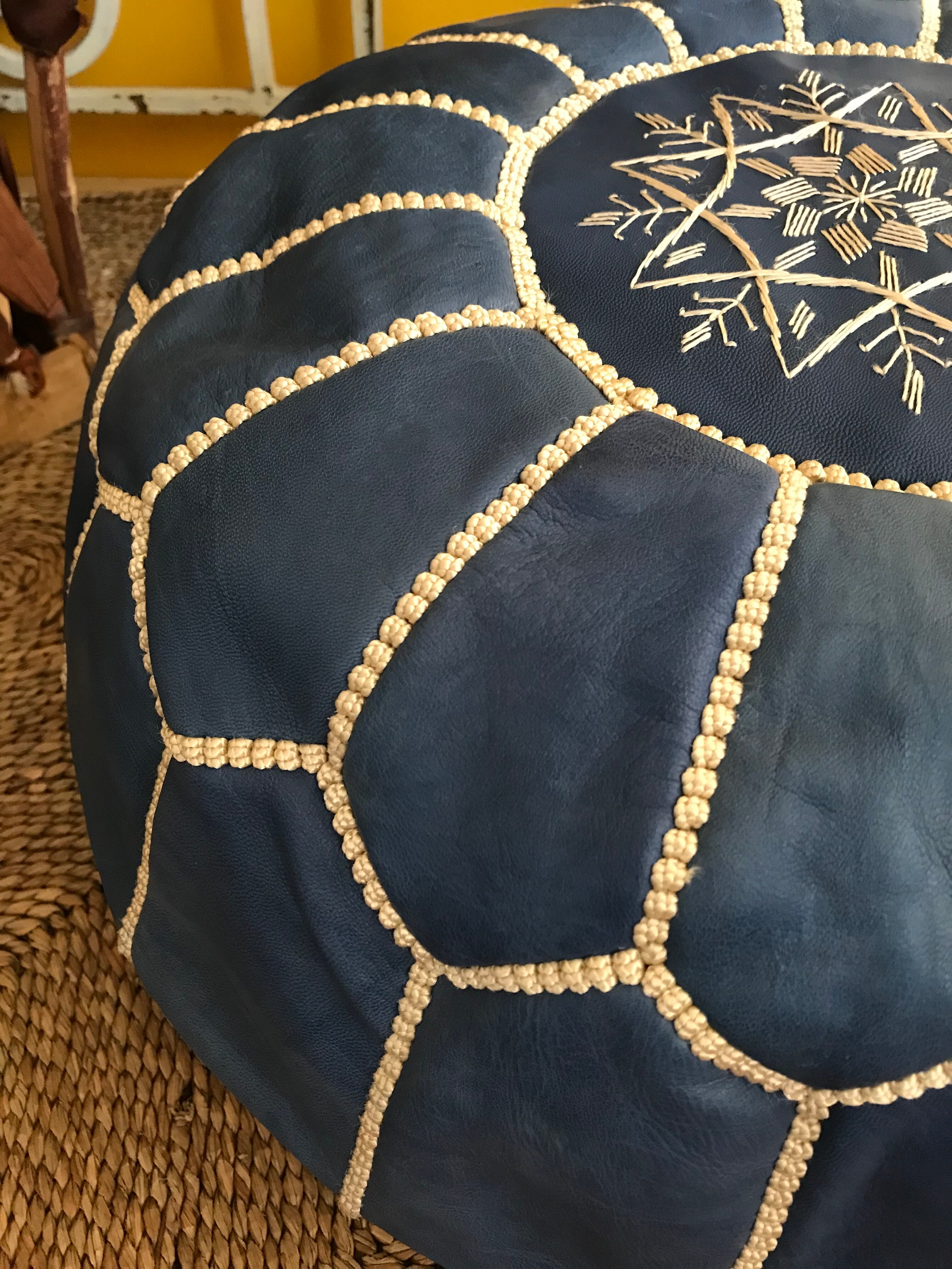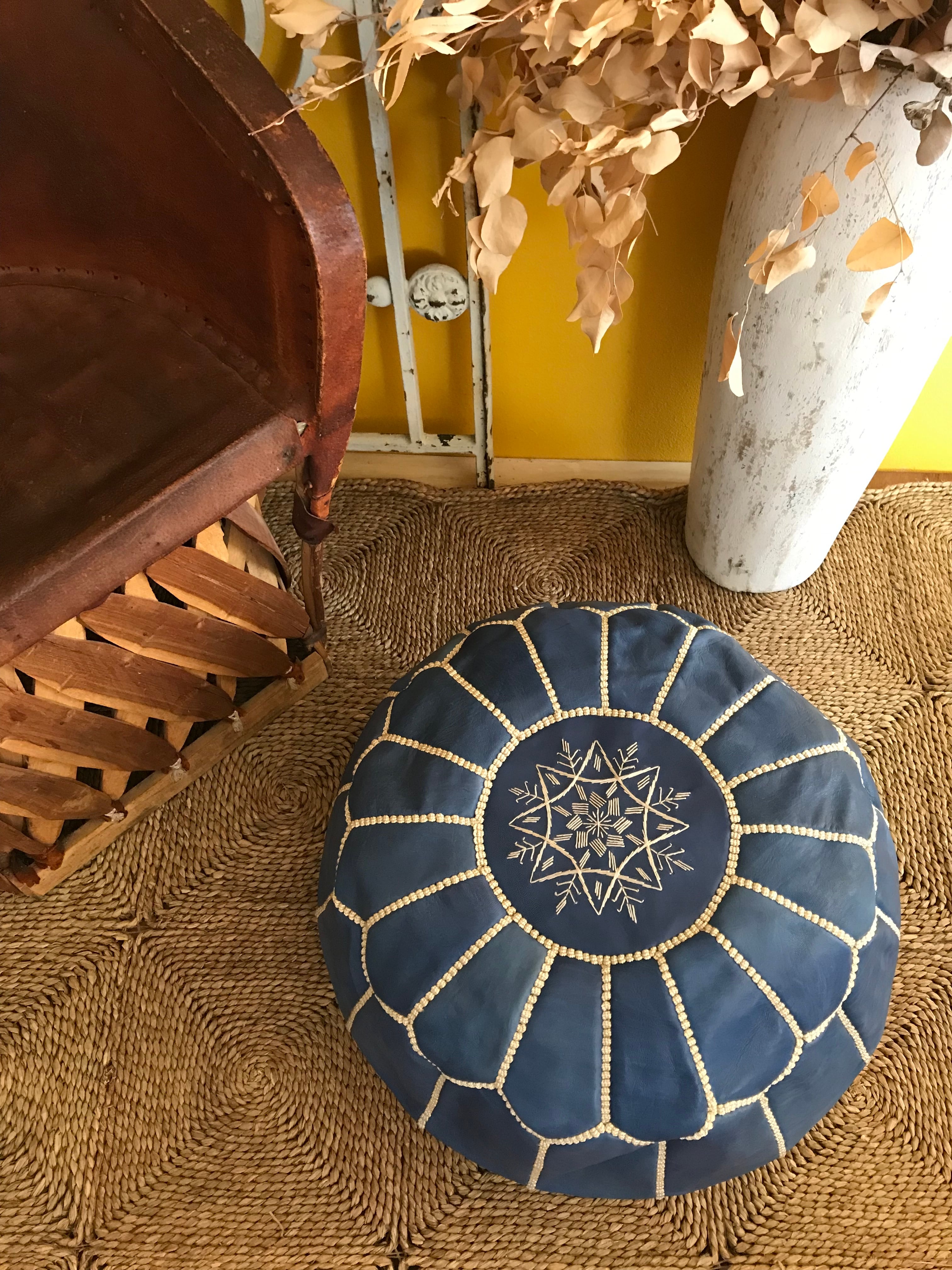 モロッコ直輸入 本革 レザープフ クッション スツール アンティークブルー
